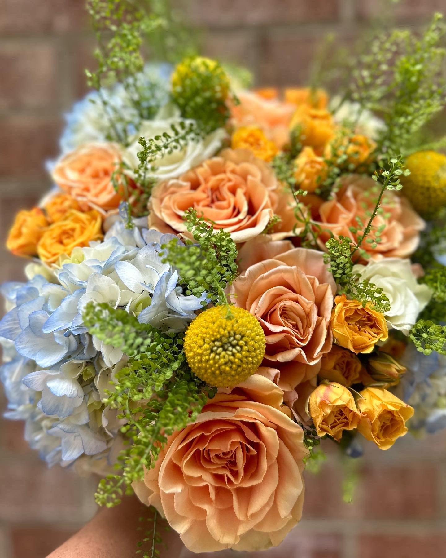 A round bouquet of 3 hydrangeas, 7 garden roses, spray roses and other seasonal flowers