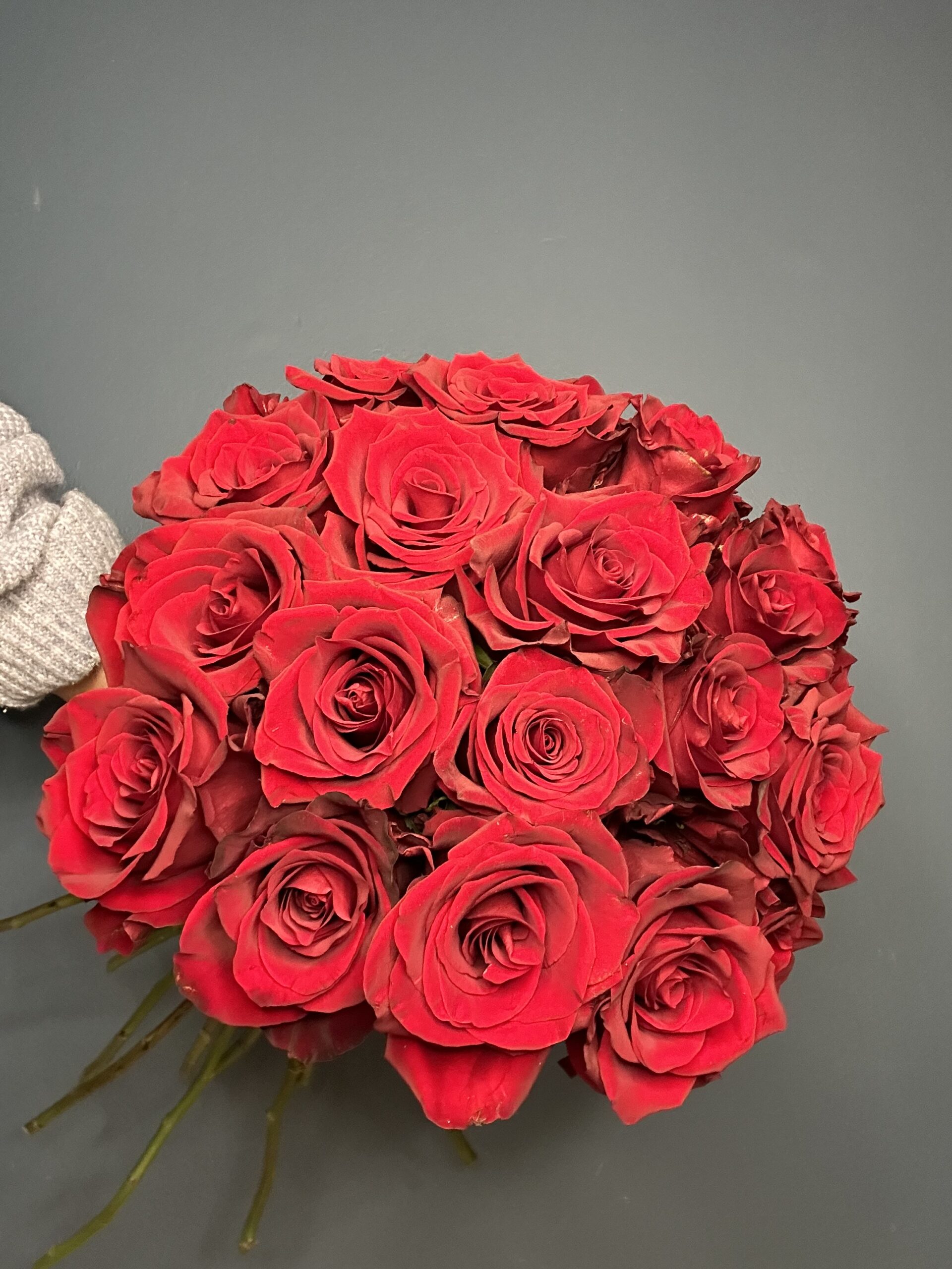 A mono-bouquet of 25 red roses in a round shape bouquet.