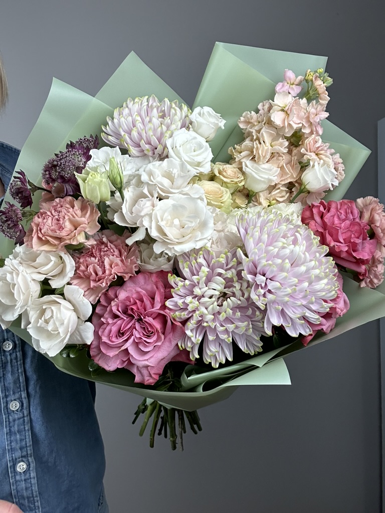Garden roses, pompom chrysanthemums, spray roses and other seasonal flowers.